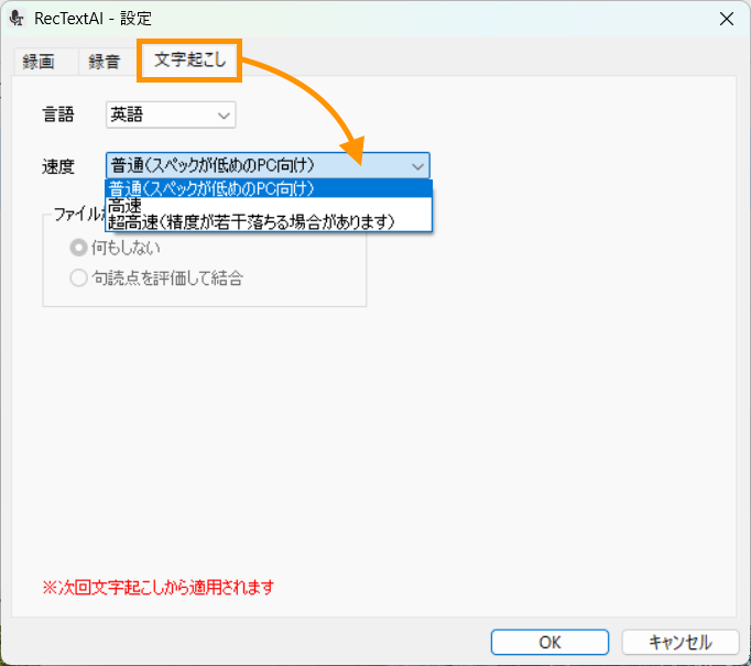 RecText AI の文字起こし設定で[普通]または[高速]を選択すると、文字起こし精度が向上する可能性があります。
