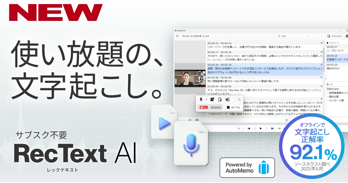 RecText AI は、ソースネクストが開発・販売する、オフラインでありながら高精度な文字起こしを実現する、買い切り型のAI文字起こしソフトです。